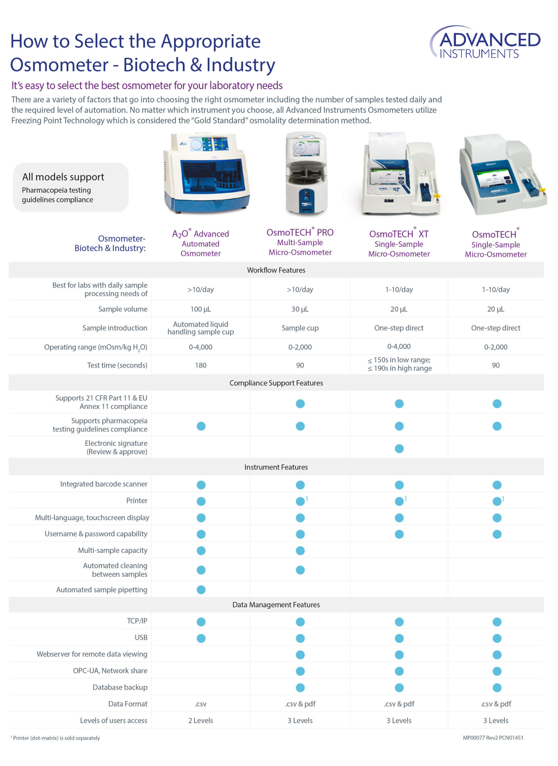 Funkcje zarządzania danymi OsmoTECH wspierają zgodność z 21 CFR część 11, a metoda pomiaru jest zgodna z zaleceniami każdej Farmakopei.