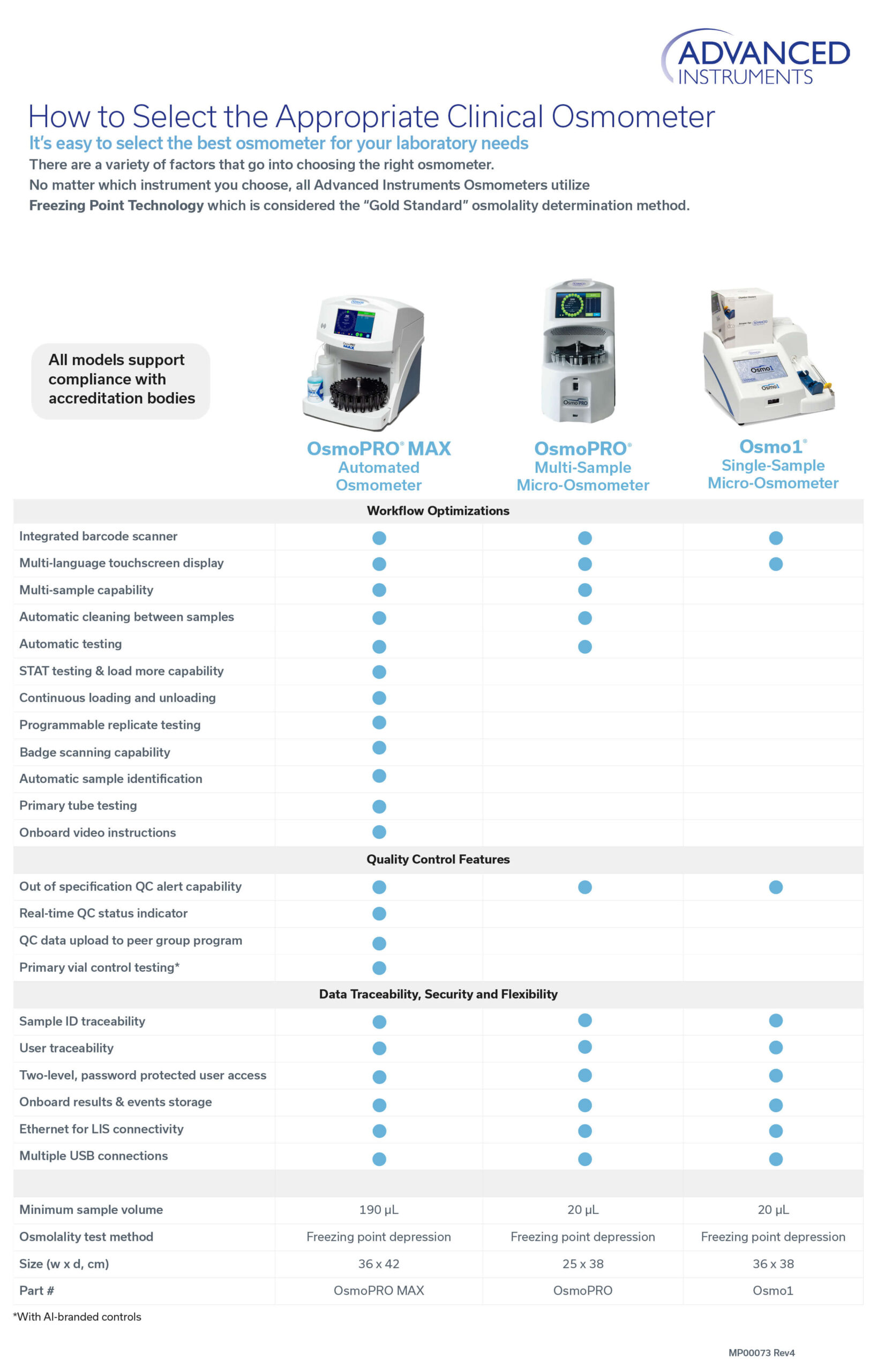 Osmometry Advanced Instruments wykorzystują preferowaną w branży metodę obniżania punktu zamarzania do oznaczania osmolalności płynów ustrojowych. Gdy substancje rozpuszczone (cząstki) są rozpuszczane w rozpuszczalniku (wodzie), punkt zamarzania roztworu obniża się w porównaniu do samego rozpuszczalnika. W miarę dodawania większej ilości substancji rozpuszczonej, punkt zamarzania obniża się jeszcze bardziej. Dlatego poprzez precyzyjne pomiary punktu zamarzania roztworu można określić osmolalność (tj. stężenie). Osmometria punktu zamarzania może określić lotne substancje w roztworach, takie jak CO2, amoniak i alkohol, w przeciwieństwie do osmometrii ciśnienia pary.